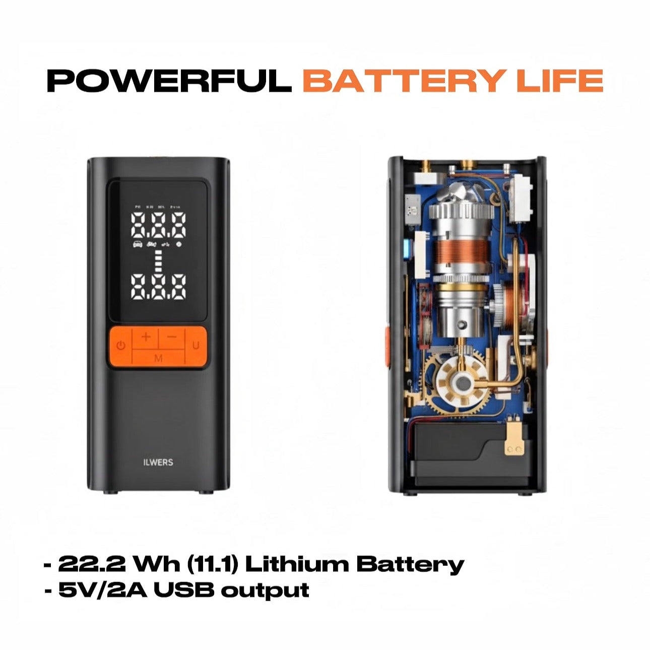 Integrated 22.2Wh (11.1V) lithium battery with 5V/2A USB output, providing both inflator power and device charging capability. -